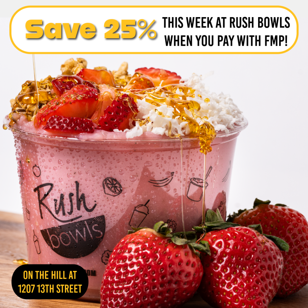 Save 25% this week at Rush Bowls when you pay with your Flatiron Meal Plan! Rush Bowls, located on the Hill at 1207 13th Street, serves up healthy and delicious fruit bowls and smoothies. Their bowls are the perfect blend of all-natural fruits and veggies topped with your choice of fresh fruits and toppers. If you are looking for a recommendation, try the Beach Bowl, made with acai, mango, banana, guava juice and topped with granola and honey. Be sure to mention the promotion at check-out to make sure you receive the discount.