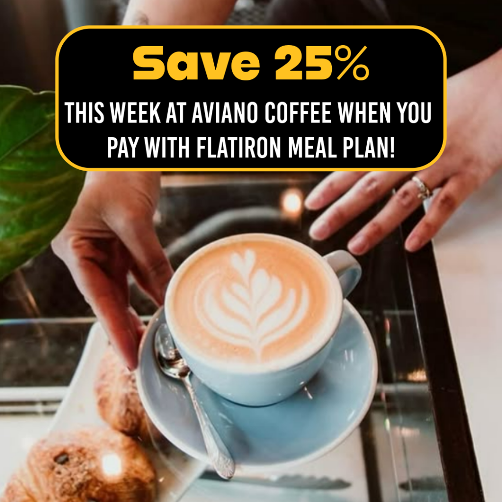 Save 25% this week at Aviano Coffee when you pay with your Flatiron Meal Plan! Aviano Coffee is located on The Hill at 1253 Pleasant Street (right next door to the Moxy Hotel) and serves up craft coffee and espresso drinks, cold brew, matcha and chai, along with pastries, grab-and-go snacks, and breakfast items like burritos—perfect for a quick stop between classes or a study break on The Hill.