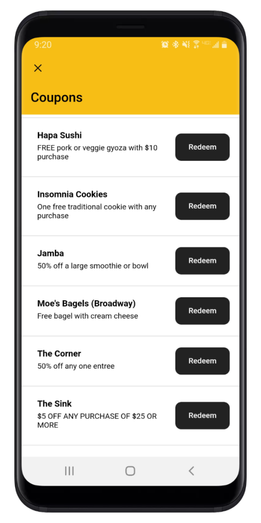 Flatiron Meal Plan cardholders will have access to dozens of exclusive coupons from our partner merchants this spring, with our back-to-school coupons and our deposit bonus coupons. The coupons can be accessed and redeemed through the Flatiron Meal Plan mobile app, and the spring 2026 coupons expire on 5/3/26. Always show the coupon on your phone to the cashier before you swipe the fork to redeem so they can apply your discount.